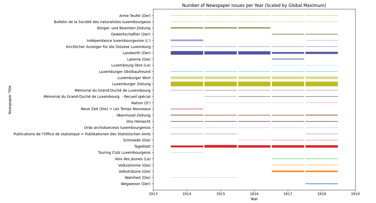 This project offers an alternative means to explore historical periods through newspapers published during the lifetimes of notable individuals. In this project, we investigate the means by which Luxembourgish newspapers treated information during historical periods, and take, as an example, the First World War (WWI).