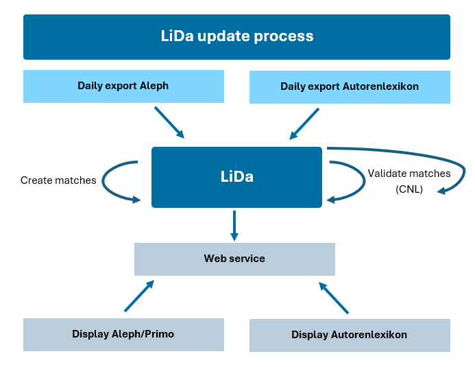 The LiDa database contains both the links between authors and those between documents. The database is automatically updated on a regular basis, using exports from the collective catalogue and Autorenlexikon systems as input.